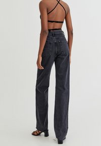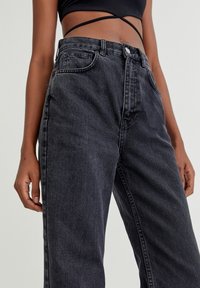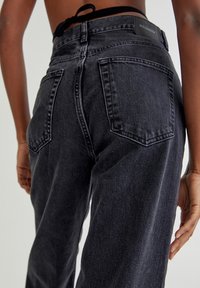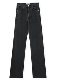 Jean noir taille haute avec une coupe droite, ourlets effilochés et une texture subtilement délavée. Comprend un design classique à cinq poches et une fermeture par boutons.