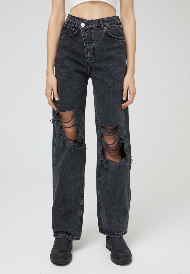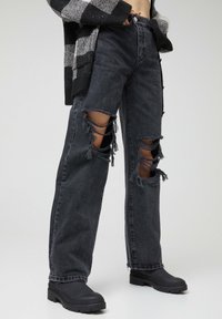 Jean en denim noir taille haute avec de grandes déchirures aux deux genoux, porté avec des bottes noires épaisses et un top blanc court.