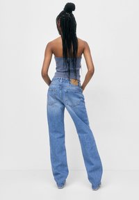 Jean en denim bleu clair à jambes larges, avec une taille haute, un design classique à cinq poches et des détails d'effet délavé. Texture douce et coupe décontractée.