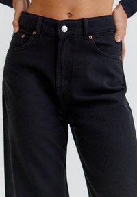 Personne portant un jean noir taille haute à jambes larges et des baskets blanches, les mains posées sur les hanches, sur un fond uni.