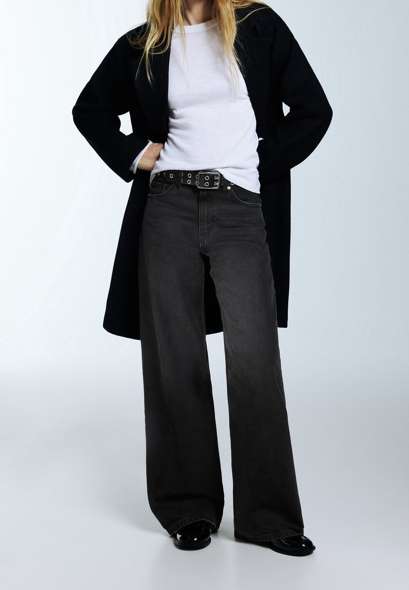 Personne portant une chemise blanche, un jean noir à jambes larges avec une ceinture noire, un manteau noir et des chaussures noires, debout les mains sur les hanches.