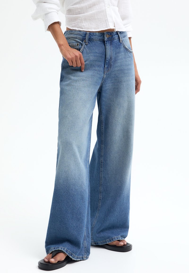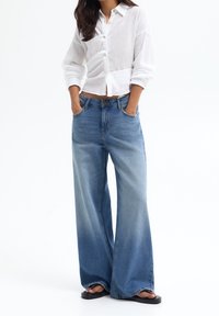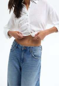 Femme portant un jean bleu clair à jambes larges et des tongs noires, associée à une chemise courte blanche boutonnée, debout devant un fond blanc.