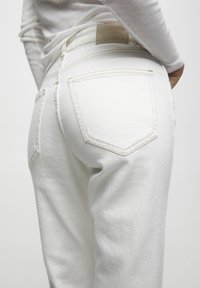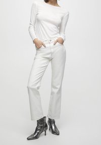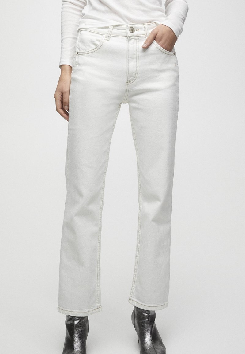 Jean en denim blanc avec une coupe droite, comprenant deux poches avant, une fermeture à bouton, et des coutures contrastantes. Stylé avec des bottines métalliques.