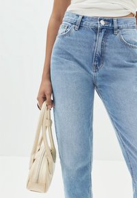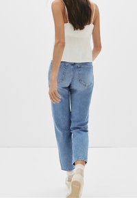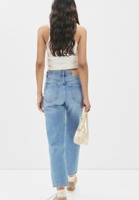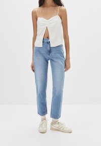 Personne portant un jean bleu clair à jambes droites, des chaussettes blanches, des baskets beiges et un haut blanc court, debout devant un fond blanc uni.
