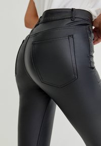 Pantalon skinny en similicuir noir à taille haute, avec des surpiqûres ton sur ton et une texture lisse, associé à des baskets blanches et beiges.