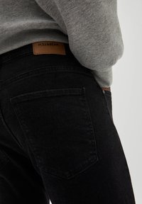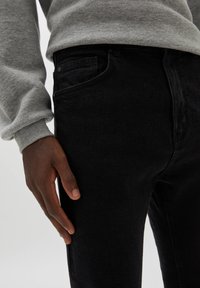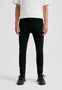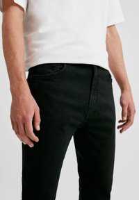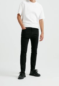 Homme portant un jean noir slim, des baskets noires et une chemise blanche à manches courtes, debout devant un fond clair uni.