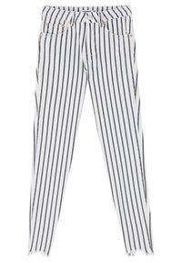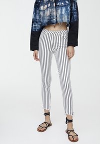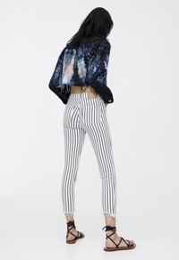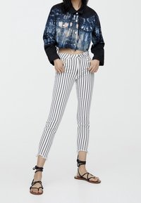 Personne portant un pantalon skinny blanc avec des rayures noires verticales, des ourlets effilochés, des sandales noires à brides, et une veste en denim tie-dye raccourcie.
