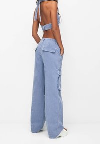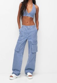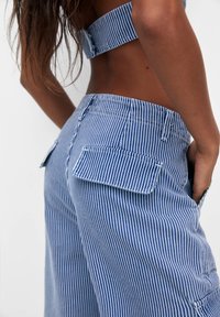 Haut court à rayures bleues et blanches et pantalon cargo à jambes larges, dotés de multiples poches, d'une fermeture à bouton et d'une coupe décontractée.