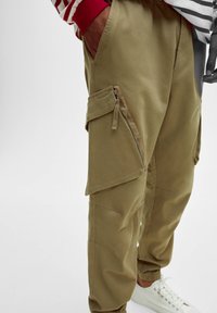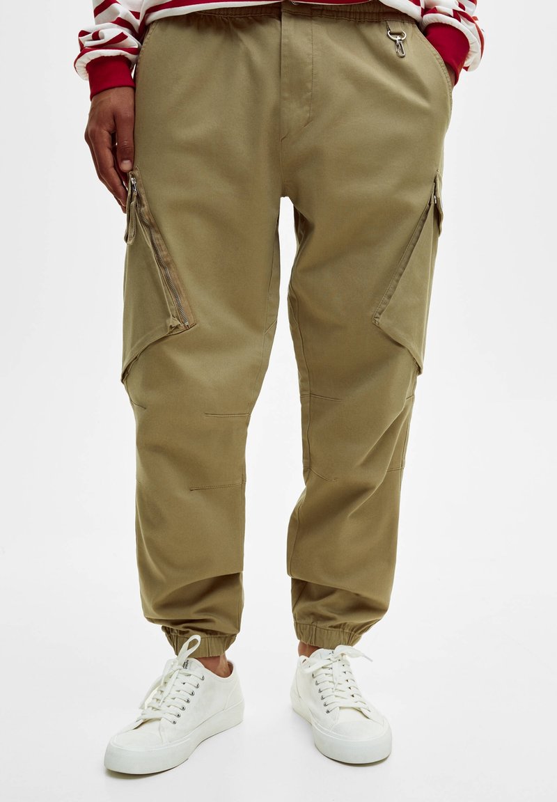 Personne portant un pantalon cargo kaki avec des poches latérales zippées, des chevilles élastiques et des baskets blanches à lacets. Mains partiellement dans les poches.
