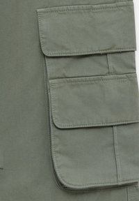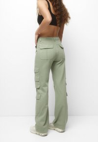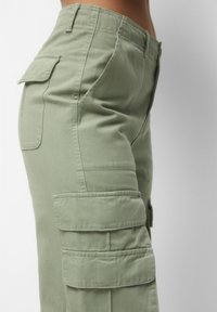 Pantalons cargo en tissu vert clair, dotés de plusieurs grandes poches, d'une coupe décontractée et d'une fermeture à bouton. Portés avec des baskets blanches.