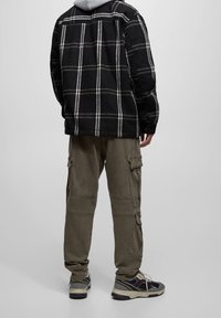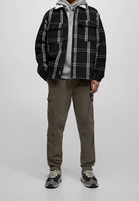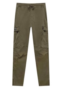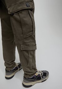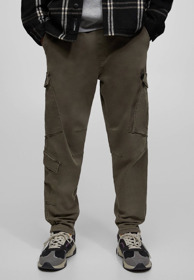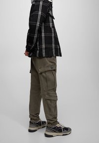 Pantalon cargo en tissu vert olive, doté de poches latérales, de détails de couture et d'une coupe fuselée. Associé à des baskets sportives noires et grises.