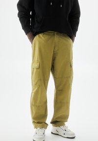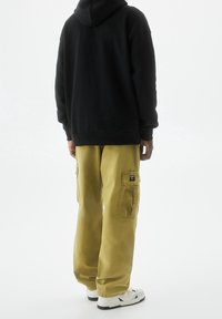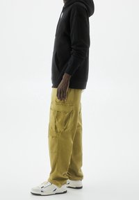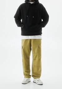 Pantalon cargo jaune avec multiples poches, poignets élastiques et coupe décontractée, associé à des baskets blanches et un sweat à capuche noir.