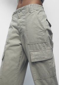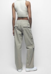 Pantalon cargo beige avec plusieurs poches, coupe droite, et tissu texturé. Associé à un col roulé blanc côtelé et des baskets blanches.