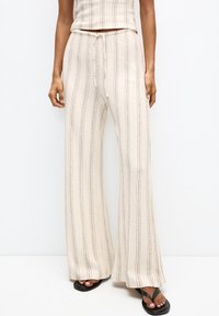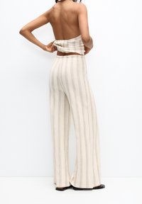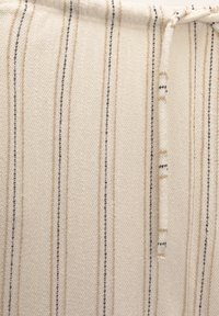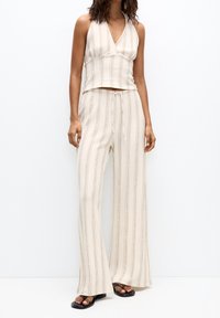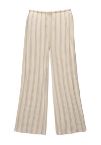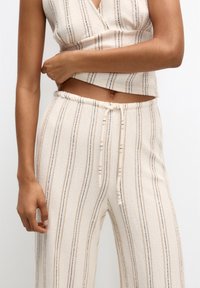 Pantalons larges beiges avec des rayures verticales et une taille à cordon. Le tissu a une finition texturée. Assortis avec des tongs noires.