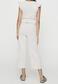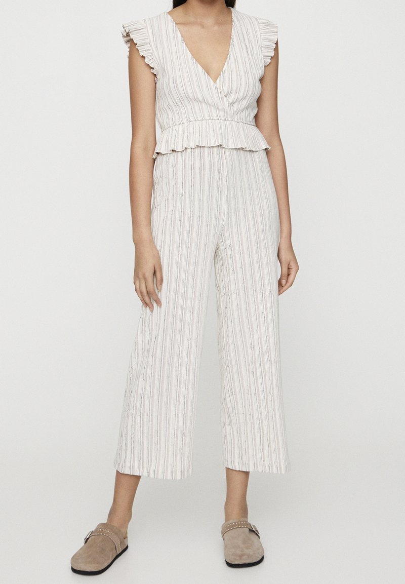 Combinaison rayée en tissu léger avec manches à volants, col en V profond, taille peplum et pantalons larges. Portée avec des chaussures beige à enfiler.