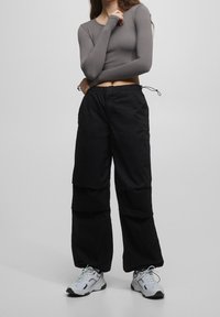 Pantalons cargo noirs avec une taille élastique, un cordon de serrage ajustable et deux poches latérales ; fabriqués dans un tissu lisse et mat avec une coupe décontractée.