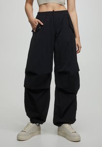 Pantalons cargo noirs avec une taille élastique, des poches latérales et une coupe décontractée, fabriqués en tissu léger et texturé, associés à des baskets blanches.