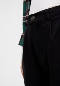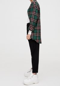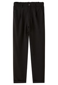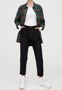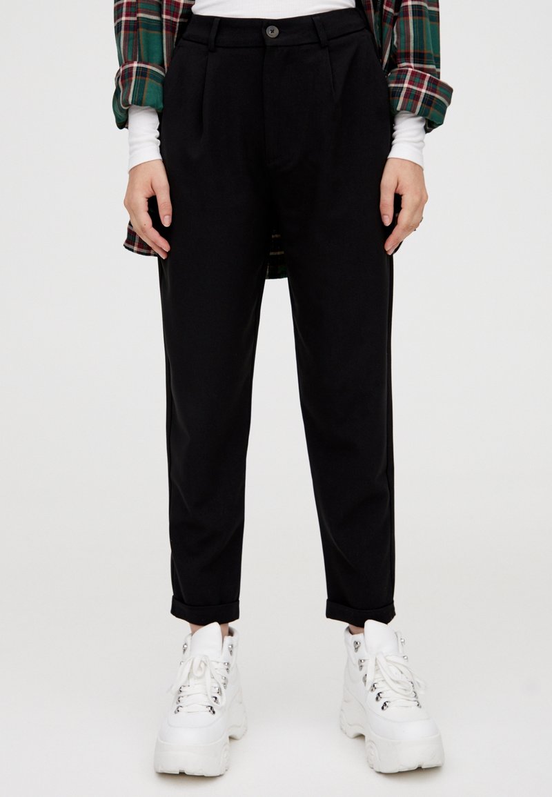 Pantalon noir fuselé avec plis sur le devant, doté d'une fermeture à bouton. Porté avec un haut blanc à manches longues et des baskets blanches épaisses.