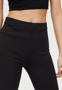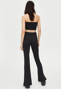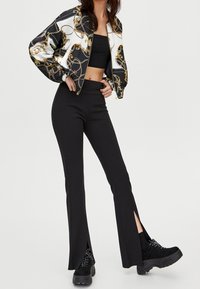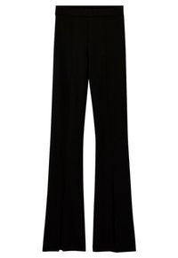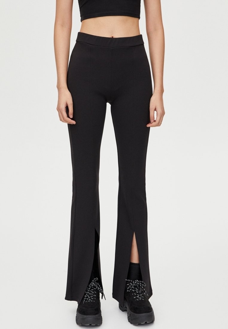 Pantalon noir évasé avec fentes latérales, en tissu stretch. Doté d'une taille haute et associé à des bottes noires à lacets.