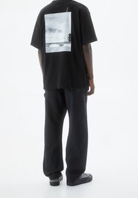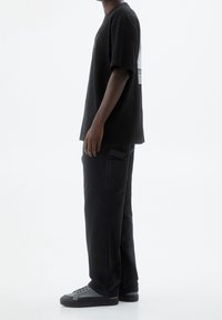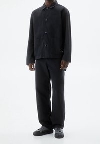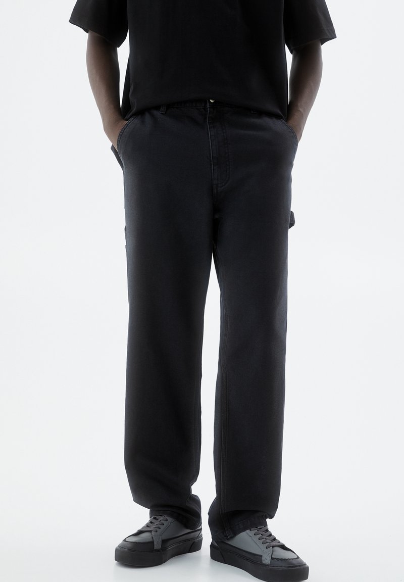 Pantalon en denim noir à coupe décontractée, doté de poches latérales, de passants pour ceinture et d'une texture lisse, associé à des chaussures gris foncé.