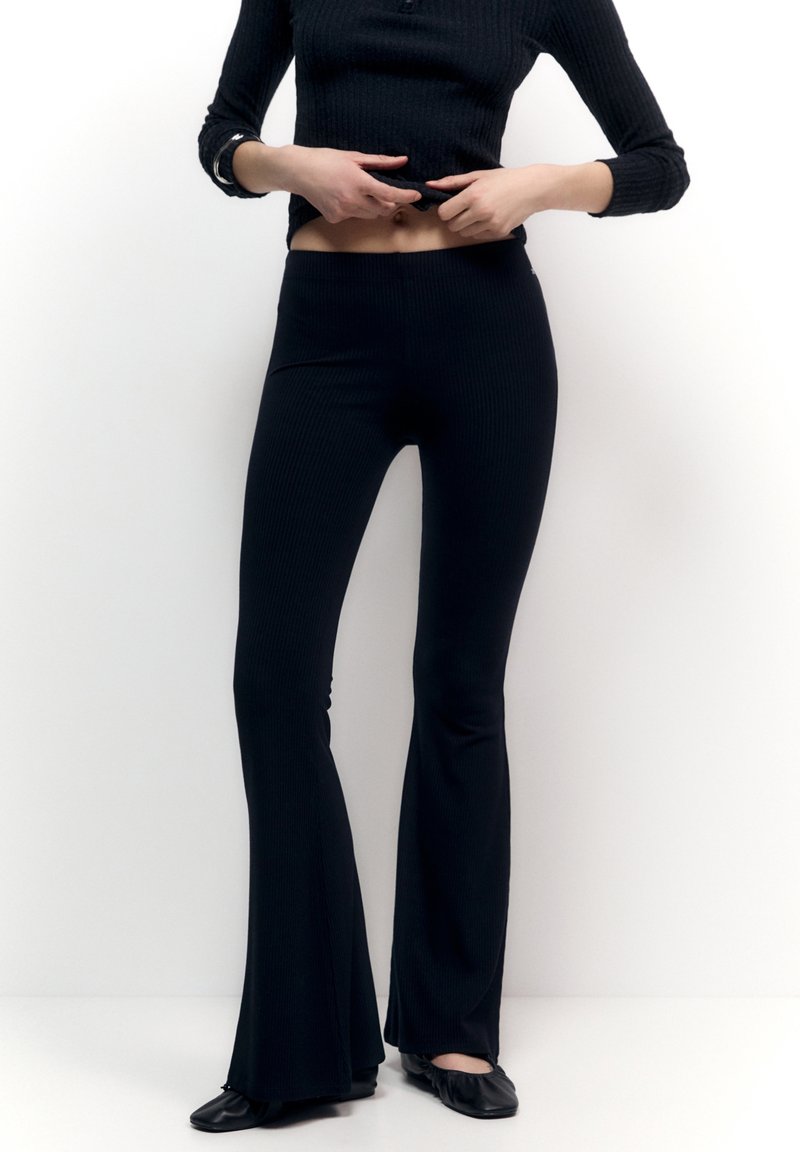 Pantalon évasé noir à côtes, texture lisse, taille haute, jambes évasées. Associé à un haut noir à manches longues côtelé.
