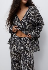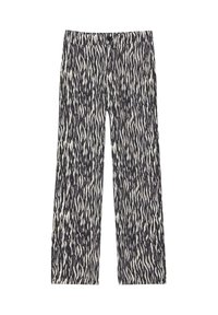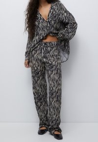 Femme portant un pantalon à imprimé zèbre noir et beige et un haut à manches longues assorti, avec des ballerines noires à bout carré sur un fond uni.