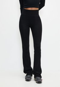 Femme portant un pantalon évasé taille haute noir et des baskets grises, debout devant un fond blanc, les mains dans le dos.