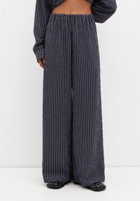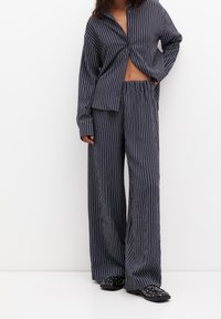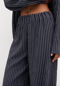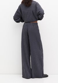 Personne portant un pantalon ample à fines rayures bleu marine et un haut à manches longues assorti, debout de dos devant un fond blanc.