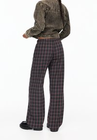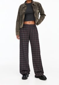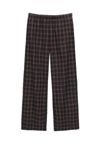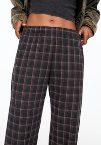 Pantalons larges à carreaux noirs et gris avec des accents rouges et verts, dotés d'une taille élastique et d'une texture douce. Stylés avec des chaussures à plateforme.