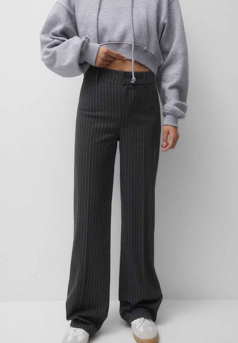 Sweat à capuche gris raccourci avec une poche frontale, associé à un pantalon large à fines rayures noir et des baskets de couleur claire.