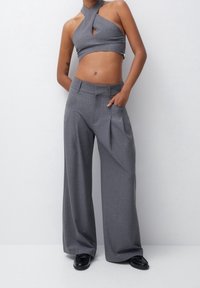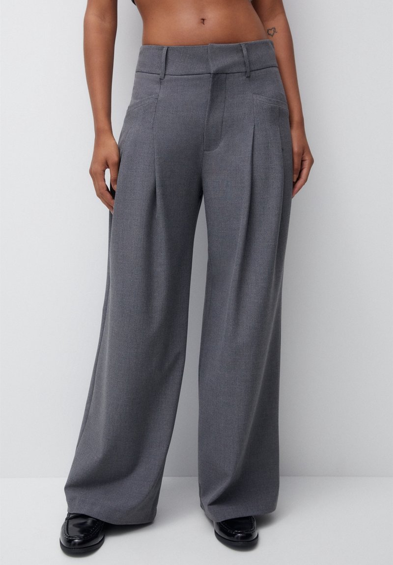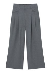 Pantalons gris à pattes larges avec plis avant, texture lisse et coupe ajustée. Présente une taille plate et des poches latérales.