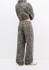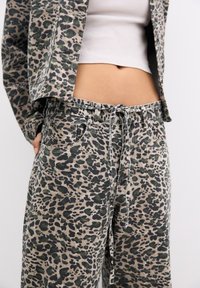 Pantalon à jambes larges imprimé léopard en tissu beige et vert foncé, avec une taille élastique et des poches latérales. Surface texturée pour plus de détails.