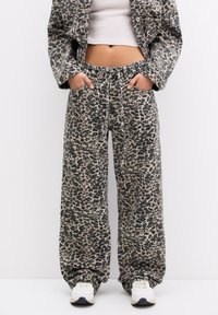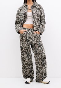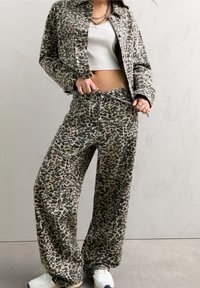 Pantalon large imprimé léopard avec veste assortie, porté avec des baskets blanches et un top court blanc, mains dans les poches.