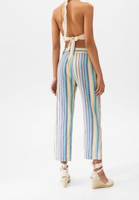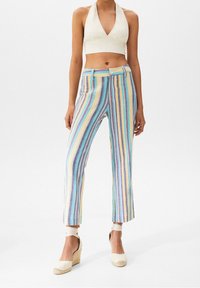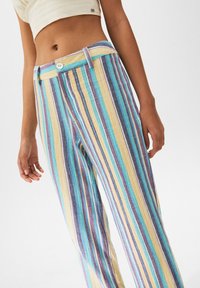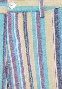 Pantalons larges rayés avec des lignes verticales dans des teintes de bleu, jaune et violet. Tissu texturé, taille haute et fermeture à bouton.