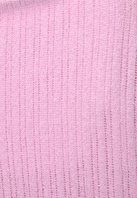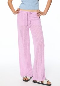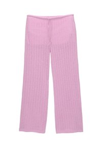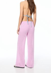 Pantalons en tricot rose clair avec une texture côtelée, un design à jambe large et une taille avec cordon de serrage, associés à des sandales à bout ouvert.