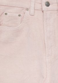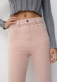 Personne portant un pantalon en velours côtelé rose clair taille haute, un pull court gris et des baskets grises à lacets blancs, debout contre un mur blanc.