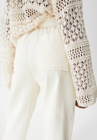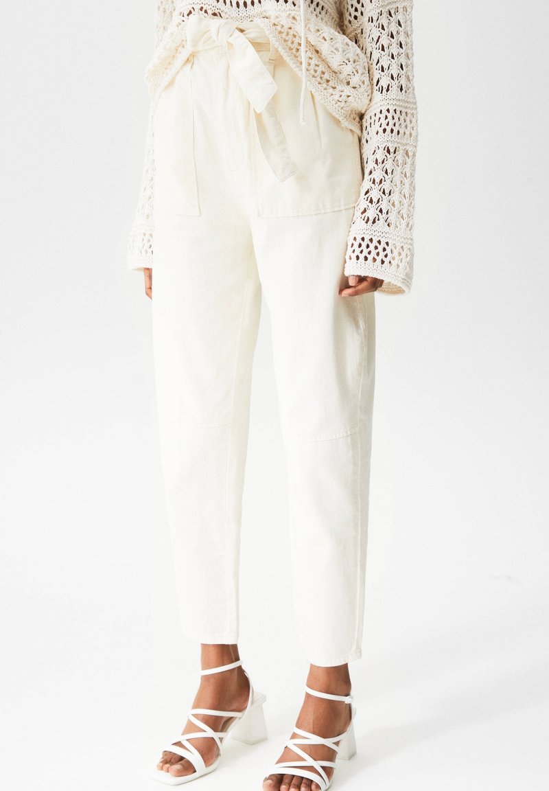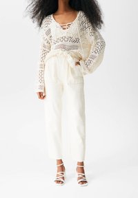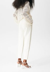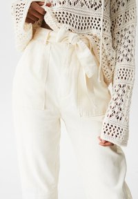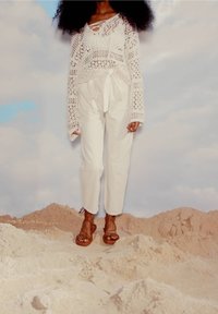 Femme portant un pantalon crème taille haute avec une ceinture en tissu, associé à un pull beige en crochet et des talons blancs à fines brides.