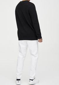 Homme portant un pull noir à manches longues côtelé, associé à un pantalon blanc, debout devant un fond clair uni.