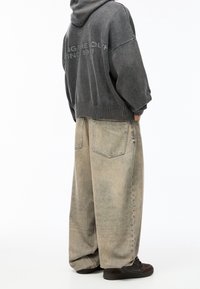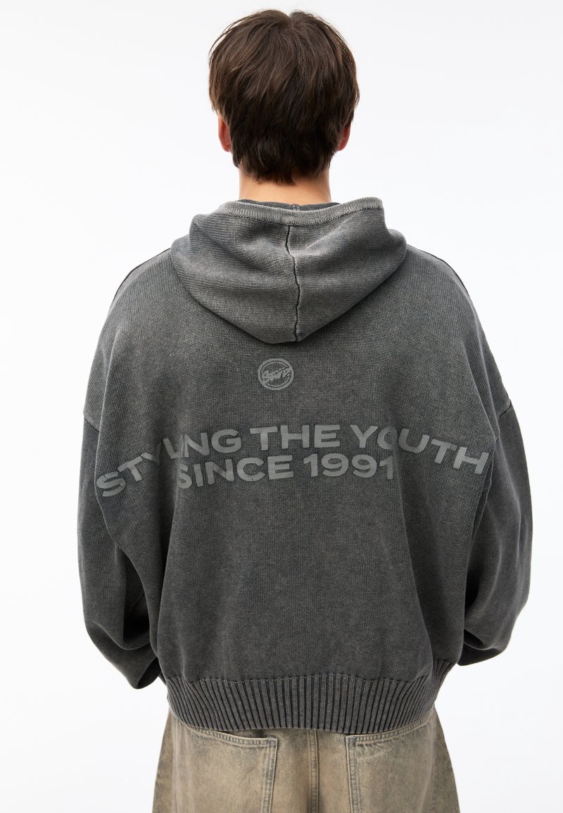 Personne portant un sweat à capuche gris foncé avec le texte « STYLING THE YOUTH SINCE 1991 » au dos, assorti à un pantalon beige.