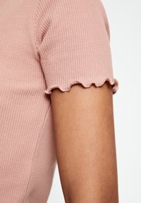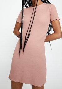 Robe courte rose côtelée avec manches courtes, bord festonné et silhouette ajustée. La texture semble douce et extensible.