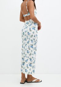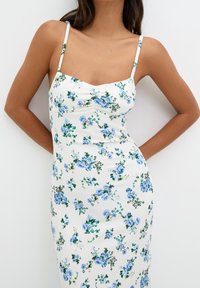 Robe midi à motifs floraux, en tissu blanc avec des motifs floraux bleus et verts, fines bretelles et silhouette ajustée. Associée à des sandales noires.
