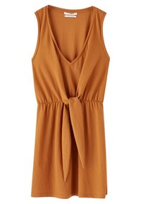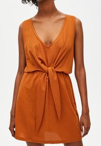 Robe sans manches orange en tissu doux, avec un décolleté en V profond et un détail de nœud sur le devant pour une taille ajustée.
