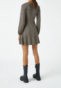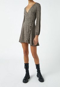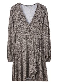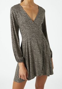 Robe à manches courtes en tissu léger avec une base beige et un motif à pois noirs, dotée d'un décolleté en V profond et d'une jupe évasée.