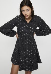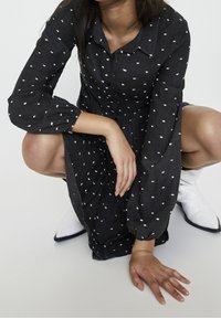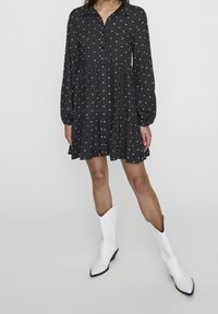 Robe en coton noire à pois blancs, devant boutonné, col, manches longues et jupe à volants. Associée à de grandes bottes de cowboy blanches à bout pointu.