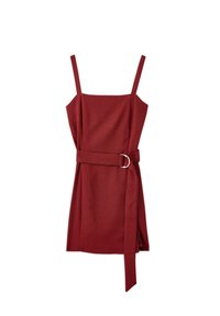 Robe écossaise rouge à encolure carrée, à fines bretelles et taille ceinturée. Présente une fente sur le côté et un motif de tissu texturé.