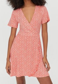 Robe portefeuille à motifs floraux rouges avec manches courtes, décolleté en V et délicat volant le long de l'ourlet. Fabriquée dans un tissu léger et texturé.