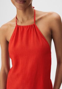 Robe rouge à bretelles avec une coupe ample, fabriquée en tissu léger. Présente un col froncé et un ourlet arrivant aux cuisses. Texture lisse, design minimaliste.