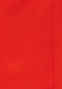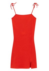 Robe mini rouge côtelée avec fines bretelles spaghetti, silhouette ajustée et fente latérale pour faciliter les mouvements. Texture lisse et extensible.