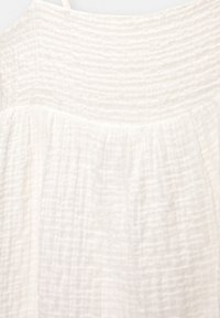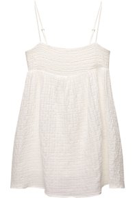 Robe mini blanche sans manches en tissu texturé et froissé. Caractérisée par des bretelles spaghetti et une jupe fluide, créant une silhouette décontractée.