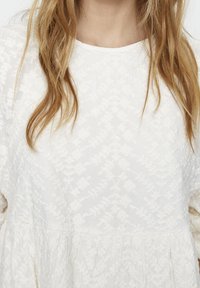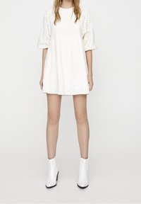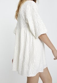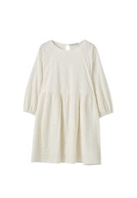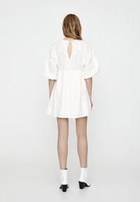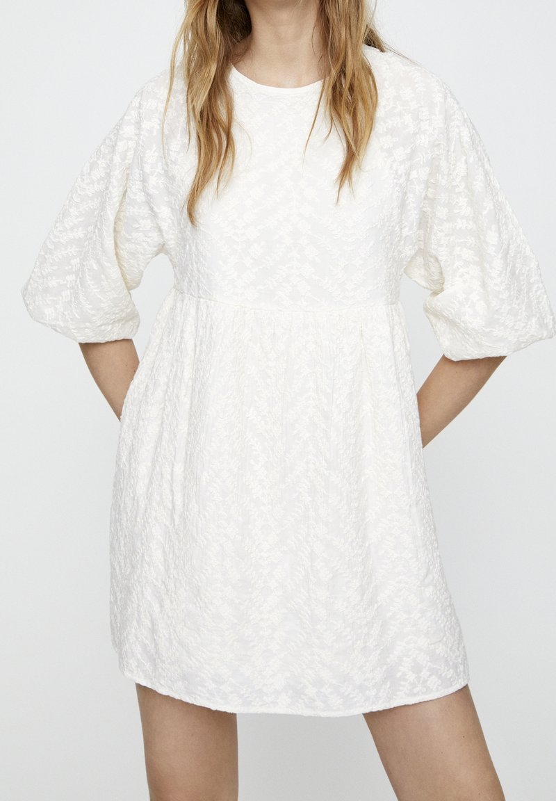 Robe courte blanche avec motif floral texturé, encolure ronde et manches bouffantes. Coupe évasée et décontractée avec taille froncée.
